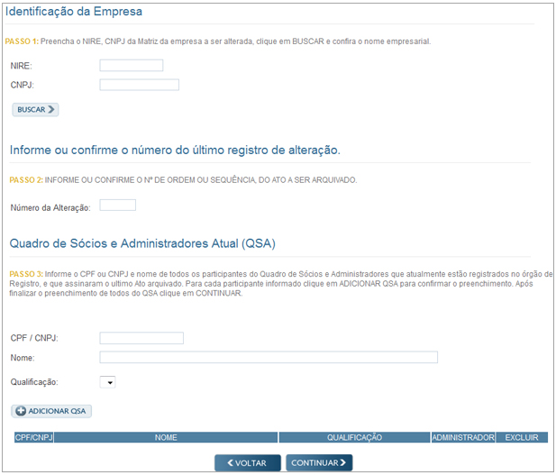 A seguir, preencha os dados ATUAIS do QSA – Quadro de Sócios e Administradores com o CPF ou CNPJ e o nome do empresário, do administrador, dos sócios ou do titular, caso a natureza jurídica da empresa seja Empresário, Sociedade Limitada ou EIRELI, respectivamente.
