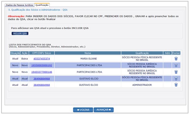 Para preencher as informações sobre a qualificação do quadro dos Sócios e Administradores (QSA), clique no número do CPF/CNPJ de cada sócio na tabela lista de sócios.